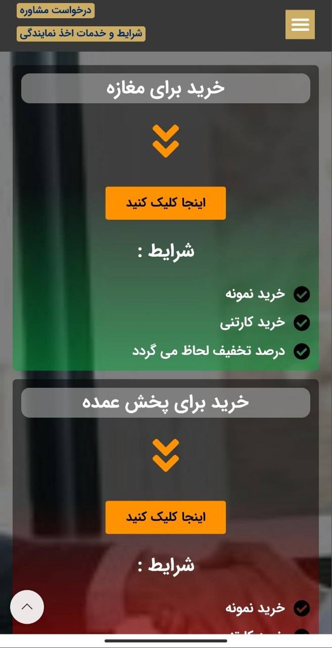 برای بخش اخذ نمایندگی، فرمهای ثبت درخواست، شرایط همکاری، و معرفی انواع گروههای محصول بهصورت شفاف و مرحلهبندیشده ارائه شده است. بخش مشاوره آنلاین نیز برای ارتباط مستقیم مدیران فروش با مشتریان، در قالب فرم و اطلاعات تماس، در نظر گرفته شده است.